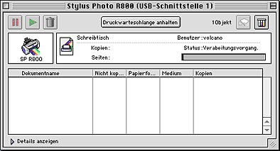 Nachdem Sie einen Druckauftrag erteilt haben, erscheint eine Schaltfläche für den EPSON Stylus Photo R800 in der Taskleiste. Klicken Sie auf dieses Symbol, um den EPSON Spool Manager zu öffnen.