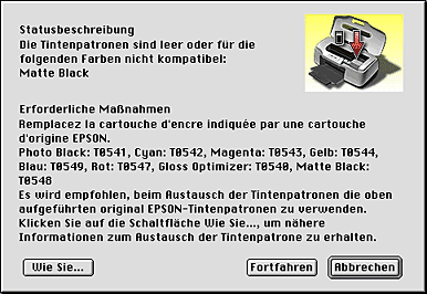 Wenn eine Tintenpatrone fast leer oder leer ist, erscheint die Schaltfläche Wie Sie... unter dem Textfeld. Wenn Sie auf die SchaltflächeWie Sie..., klicken, zeigt EPSON Status Monitor 3 Schritt-für -Schritt-Anweisungen zum Austauschen der Tintenpatronen an.