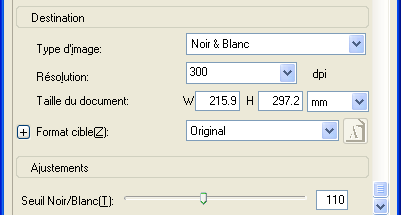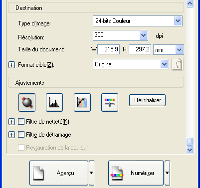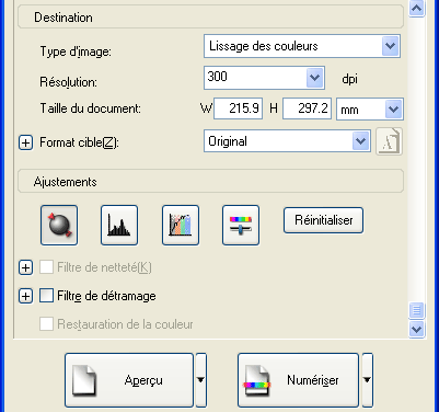 ![]() | Indiquez le format de sortie des images numérisées à l'aide du paramètre Format cible et, si nécessaire, définissez ensuite les paramètres Ajustements. Pour plus de détails, reportez-vous à la section Création de reproductions magnifiques. |