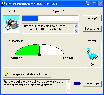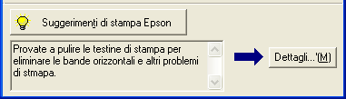 Nella casella di testo della parte inferiore della finestra della barra di avanzamento vengono visualizzati suggerimenti per sfruttare al meglio il driver della stampante Epson. Ogni 30 secondi viene visualizzato un nuovo suggerimento. Per informazioni dettagliate sul suggerimento visualizzato nella finestra, fare clic sul pulsante Dettagli.