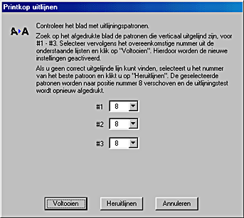 Kies van elk patroon op het afgedrukte testblad de verticale lijn die het beste is uitgelijnd. Selecteer in het dialoogvenster Printkop uitlijnen het betreffende lijnnummer in de keuzelijst en klik vervolgens op Voltooien om de nieuwe instelling door te voeren.