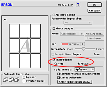 Esta opção permite imprimir as imagens com o formato de um poster aumentando uma página de forma a abranger várias folhas de papel.