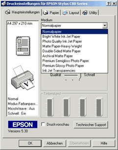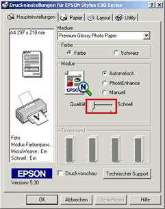 Die Medieneinstellungen des Treibers müssen mit dem verwendeten Medium übereinstimmen. Sie sollten dabei ausschließlich Original-EPSON-Medien verwenden. Vergewissern Sie sich, dass die Medien mit der bedruckbaren Seite nach oben eingelegt sind. Wählen Sie die höchste Druckqualitätsstufe aus, um die besten Druckergebnisse zu erhalten. Schieben Sie dafür den Schieberegler Druckqualität auf die Einstellung Qualität.