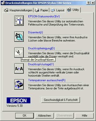 Klicken Sie auf die Registerkarte Utility. Klicken Sie auf Druckkopfreinigung.
