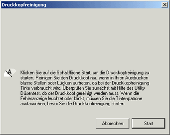 Wiederholen Sie den Vorgang, bis das Problem behoben ist. Wenn das Problem durch die Reinigung nicht behoben wird, wird das Einsetzen eines neuen Sets von Tintenpatronen empfohlen. Wenn das Düsentestmuster korrekt ist, im Ausdruck des Textes jedoch weiterhin Unterbrechungen auftreten, müssen Sie möglicherweise das Utility zur Druckkopfausrichtung ausführen. Klicken Sie hier, um Informationen hierzu zu erhalten: Wie wird das Utility "Druckkopfausrichtung" unter Windows 2000 oder XP verwendet? Artikel: KB020002 Sprache: Deutsch Produktreihe: Ink Jet/Multifunktion |