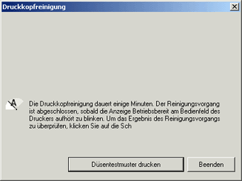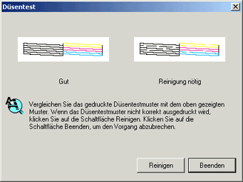 Der Drucker druckt ein Düsentestmuster. Vergleichen Sie den Ausdruck mit dem Muster im folgenden Fenster. Wenn der Ausdruck Lücken oder fehlerhafte Stellen enthält, klicken Sie auf Reinigen. Wenn der Ausdruck korrekt ist, klicken Sie auf Beenden.