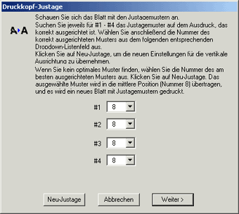 Die Druckköpfe sind korrekt ausgerichtet, wenn die gedruckten Linien mittig ausgerichtet sind, in diesem Fall unter Nummer 8. Artikel: KB020007 Sprache: Deutsch Produktreihe: Ink Jet/Multifunktion |