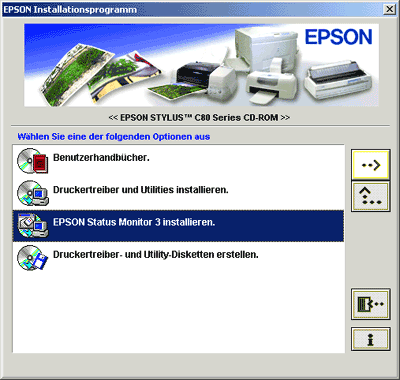 der Tintenpatronen des EPSON Stylus-Druckers unter Windows 2000 oder XP? Vorgehensweise Legen Sie die mit dem Drucker gelieferte EPSON-Druckersoftware-CD-ROM ein. Das hier angeführte Beispiel bezieht sich auf den EPSON Stylus C60. Wählen Sie EPSON Status Monitor, und klicken Sie auf den nach rechts weisenden Pfeil.