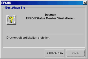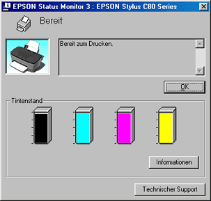 der Tintenpatronen des EPSON Stylus-Druckers unter Windows 98 oder ME? Vorgehensweise Legen Sie die mit dem Drucker gelieferte EPSON-Druckersoftware-CD-ROM ein. Das hier angeführte Beispiel bezieht sich auf den EPSON Stylus C80. Wählen Sie EPSON Status Monitor, und klicken Sie auf den nach rechts weisenden Pfeil. Klicken Sie auf OK.