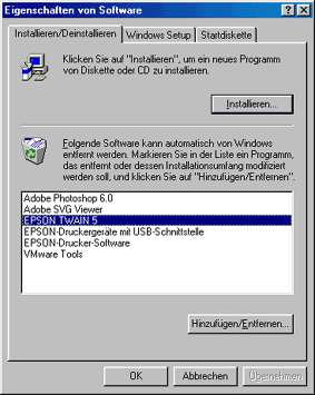 Markieren Sie EPSON TWAIN, und klicken Sie auf Ändern/Entfernen. Unter Windows 98 und ME heißt diese Schaltfläche Hinzufügen/Entfernen.