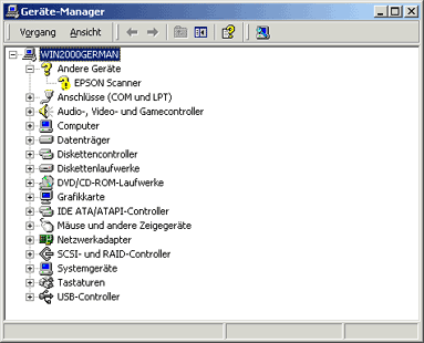 Überprüfen Sie, ob eines der im Geräte-Manager aufgeführten Geräte mit einem Frage- oder Ausrufezeichen gekennzeichnet ist, wie es im Folgenden dargestellt ist. Wenn bei den Einträgen Bildverarbeitungsgeräte, EPSON Scanner oder Andere Geräte ein Frage- oder Ausrufezeichen angezeigt wird, markieren Sie den entsprechenden Eintrag per Mausklick.