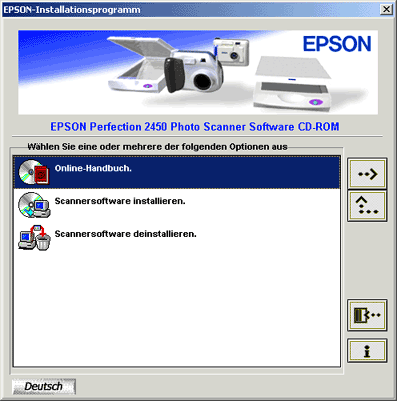Vorgehensweise Legen Sie die CD-ROM mit der Scannersoftware in das CD-ROM-Laufwerk ein. Wählen Sie Scannersoftware installieren, und klicken Sie auf den nach rechts weisenden Pfeil.