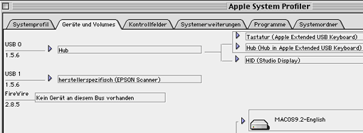 Vergewissern Sie sich, dass der Scanner eingeschaltet und das USB-Kabel ordnungsgemäß am MAC und am Scanner angeschlossen ist. Sie können den Apple System Profiler verwenden, um die Installation zu überprüfen. Klicken Sie auf das Apple-Symbol, und wählen Sie Apple System Profiler aus. Wählen Sie die Registerkarte Geräte und Volumes aus, und stellen Sie sicher, dass der Scanner aufgeführt ist. In diesem Fall ist er an USB1 angeschlossen.
