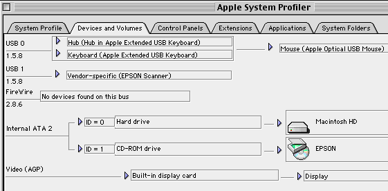 Firstly check that the scanner is switched on and that the USB cable is firmly seated into your MAC and scanner. We can use the Apple system profiler to confirm installation. Click the apple icon and select Apple System Profiler. Select the Devices and Volumes tab and check that the scanner is present. In this case USB1.