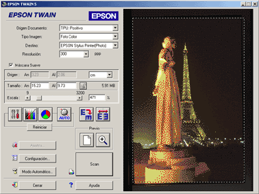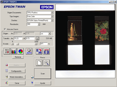 escanear mediante la unidad de transparencias (TPU)? Instrucciones Con el escáner apagado, conecte la unidad de transparencias (TPU). A continuación, encienda el escáner y espere a que se complete el proceso de iniciación. Cuando esté preparado para comenzar a escanear, abra el programa y acceda a EPSON TWAIN. Los ejemplos utilizados se han llevado a cabo con EPSON TWAIN PRO. Deberá cambiar el campo Origen Documento según el tipo de película que esté utilizando (Positivo/Negativo). A continuación, haga clic en Previo.