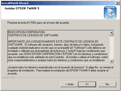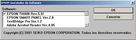 ME, 2000 y XP? Instrucciones En este ejemplo se utiliza Perfection 1650. Introduzca el CD-ROM del software del escáner EPSON suministrado con el escáner. Haga clic en Instalar el software del escáner y haga clic en la flecha que señala hacia la derecha. Seleccione EPSON TWAIN y haga clic en OK.