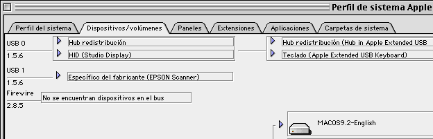 Asegúrese de que el escáner está encendido y que el cable USB está conectado correctamente. Intente conectar el cable a un puerto diferente del MAC. Intente reinstalar el controlador. Intente utilizar un cable diferente. Si la reinstalación no solucione el problema, es posible que exista un conflicto de extensiones. Póngase en contacto con el servicio de asistencia de Apple para obtener ayuda. Cuando aparezca este mensaje de error, siga estas instrucciones: En primer lugar, compruebe que el escáner está encendido y que el cable USB está acoplado firmemente al MAC y al escáner. Se puede utilizar el Perfil de sistema Apple para comprobar la instalación. Haga clic en el icono Apple y seleccione Perfil de sistema Apple. Seleccione la ficha Dispositivos/volúmenes y compruebe que aparece el escáner. En este caso es USB 1.