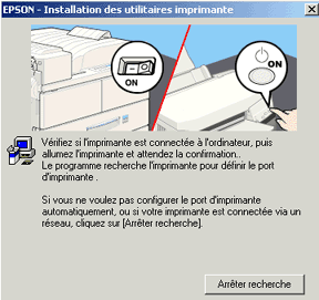 imprimante USB sous Windows 2000 ou XP ? Instructions Insérez le CD-ROM du logiciel d’impression EPSON, puis sélectionnez Install EPSON Printer Driver / Utility. Vérifiez sur l’écran suivant que le câble USB est relié à l’imprimante et à l’ordinateur, puis allumez l’imprimante