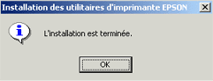 Cliquez sur OK pour terminer l’installation. Vous devez installer l’utilitaire EPSON Status Monitor pour pouvoir surveiller les niveaux d’encre de votre imprimante. Il est fourni sur le CD-ROM du logiciel d’impression EPSON. Cliquez sur le lien suivant pour obtenir de plus amples informations sur cette procédure : Article: KB020005 Langue: Français Gamme de Produits: Jet d’encre |
