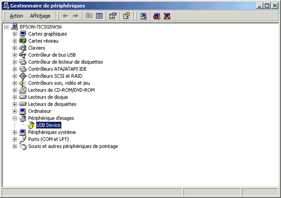 En supposant que le problème n’est pas lié aux contrôleurs USB, vous devez examiner les éléments suivants dans le Gestionnaire de périphériques : Scanner EPSON ou Autres périphériques. Intéressez-vous également à ces éléments s’ils sont précédés d’un point d’interrogation. Cela signifie que le scanner n’est pas correctement installé. Pour résoudre ce problème, procédez comme suit. Sélectionnez Scanner EPSON ou Autres périphériques en cliquant dessus.