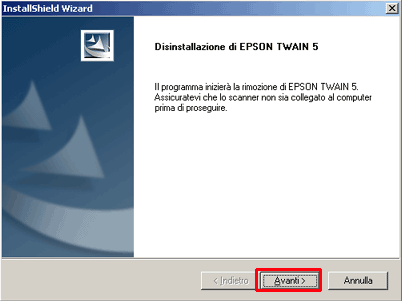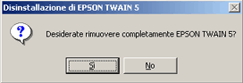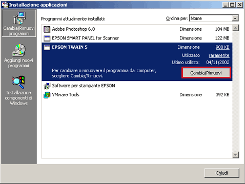 Evidenziare EPSON TWAIN e fare clic su Cambia/Rimuovi. In Windows 98 e ME il pulsante è denominato Aggiungi/Rimuovi.