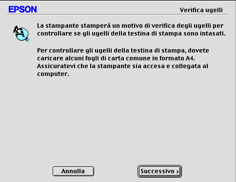 In quale modo si utilizza l'utility Verifica ugelli per risolvere i problemi di qualità di stampa scadente su MAC OS Classic? L'utility Verifica ugelli si trova nella finestra delle utility del driver per la stampante. Per accedere alle utility fornite con il driver EPSON è necessario fare clic sulla Scrivania, fare clic su File e quindi selezionare Stampa Scrivania. Fare clic sull'icona degli strumenti (una chiave americana e un cacciavite) e selezionare l'utility Verifica ugelli, quindi seguire le istruzioni visualizzate. Per proseguire, fare clic sul collegamento per ottenere istruzioni sulle modalità di accesso alla finestra delle opzioni di utility della stampante: In quale modo si utilizzano le utility del software per la stampante in MAC OS Classic? Fare clic sull'icona Verifica ugelli.