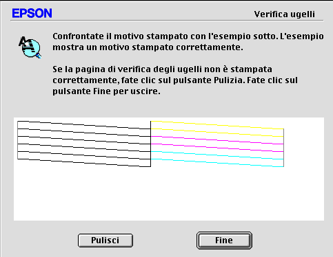 Confrontare la propria stampa con gli esempi visualizzati. Se la stampa presenta interruzioni o spazi vuoti, è necessario fare clic su Pulisci e seguire le istruzioni.
