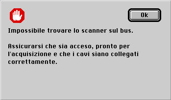 Assicurarsi che lo scanner sia acceso e che il cavo USB sia collegato saldamente. Provare a collegare il cavo a una porta differente sul MAC. Provare a reinstallare il driver. Provare a utilizzare un altro cavo. Se la reinstallazione non risolve il problema, è possibile che si sia verificato un conflitto di Estensioni. Contattare il supporto Apple per risolvere questo problema. Se viene visualizzato questo messaggio di errore, seguire le istruzioni riportate di seguito.