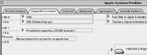 Per prima cosa, verificare che lo scanner sia acceso e che il cavo USB sia saldamente collegato al MAC e allo scanner. È possibile utilizzare Apple System Profiler per verificare l'installazione. Fare clic sull'icona Apple e selezionare Apple System Profiler. Selezionare la scheda Dispositivi e volumi e verificare che lo scanner sia presente, in questo caso USB1.