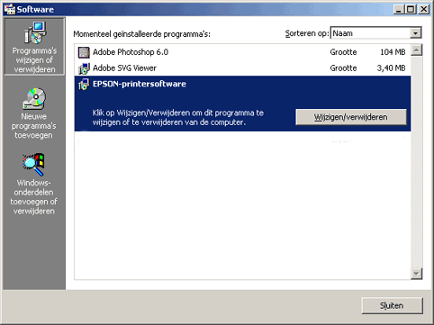 Er wordt een lijst weergegeven met op de computer geïnstalleerde software. Selecteer EPSON-printersoftware en klik op Toevoegen/Verwijderen.