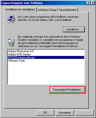 Dubbelklik op het pictogram Software. Selecteer EPSON-printersoftware en klik op Toevoegen/Verwijderen.