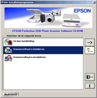 Perfection 1250, 1650 en 2450 in Windows 98, ME, 2000 en XP? Instructies In het voorbeeld gebruiken we de Perfection 1650. Plaats de cd-rom met EPSON-scannersoftware die bij de scanner wordt geleverd in het cd-rom-station. Klik op Scannersoftware installeren en klik op de naar rechts wijzende pijl.