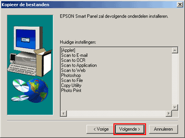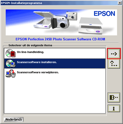 PANEL? Instructies Plaats de cd-rom met EPSON-scannersoftware in het cd-rom-station. Klik op Scannersoftware installeren en klik op de naar rechts wijzende pijl.