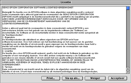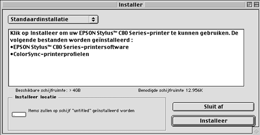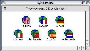 Als u een USB-printer wilt installeren, plaatst u de cd-rom met EPSON-printersoftware in het cd-rom-station en volgt u de instructies op het scherm. Na de installatie configureert u de printer in de Kiezer. Selecteer het keuzerondje Inactief bij AppleTalk en het keuzerondje Aan onder Afdrukken op de achtergrond. Controleer of er een geldige poort in de Kiezer wordt weergegeven als de printer is ingeschakeld. Plaats de cd-rom met EPSON-printersoftware in het cd-rom-station en selecteer de gewenste taal. In het voorbeeld is een EPSON Stylus C80 gebruikt.