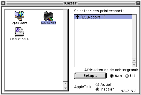 Controleer of er een geldige poort wordt weergegeven, in dit geval (USB-poort 1). Selecteer het keuzerondje Aan onder Afdrukken op de achtergrond en het keuzerondje Aan bij AppleTalk. De printer is nu gereed voor gebruik. Artikel: KB020111 Taal: Nederlands Produkt Reeks: Inkjet |
