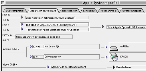 Controleer eerst of de scanner is ingeschakeld en of de USB-kabel stevig is aangesloten op de Mac en de scanner. U kunt de installatie controleren in Apple Systeemprofiel. Open het Apple-menu en kies Apple Systeemprofiel. Klik op de tab Apparaten en volumes en controleer of de scanner is geïnstalleerd. In dit geval is dat USB1.