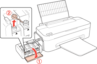 افتح غطاء وحدة خزان الحبر ثم قم بإزالة غطاء خزان الحبر.