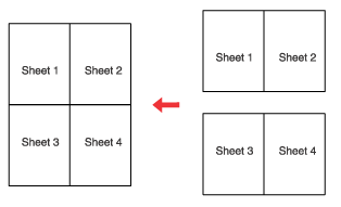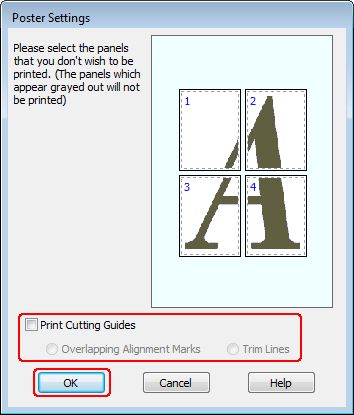 فيما يلي مثال حول طريقة إنشاء ملصق عن طريق تحديد الإعداد 2x2 أسفل Poster Printing ‏(طباعة ملصق) وتحديد الإعداد Overlapping Alignment Marks (علامات محاذاة متراكبة) كـ Print Cutting Guides (طباعة موجهات القطع).