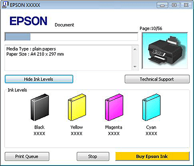 Индикаторът за изпълнение се появява автоматично, когато стартирате заявка за печат. Можете да проверите състоянието на касетата за мастило от този прозорец. Кликнете върху бутон Check Ink Levels (Провери нивата на мастилото) на екрана на индикатора за изпълнение, за да се изведе състоянието на касетата за мастило, както е показано по-долу.