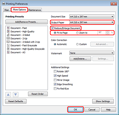 Кликнете върху раздел More Options (Повече опции), след това отметнете Reduce/Enlarge Document (Намалява/Увеличава документ).