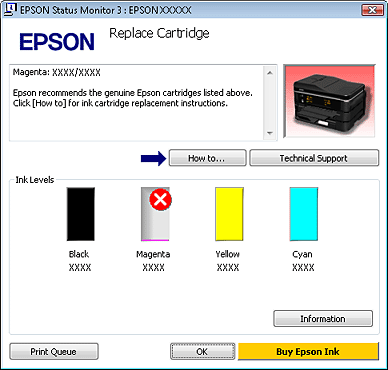 Ако мастилото е с ниско ниво или се е изчерпало, се появява бутон How to (Как да) в прозореца EPSON Status Monitor 3. Кликването върху How to (Как да) извежда инструкции за подмяна на касетите за мастило и премества печатащата глава към позиция за подмяна на касетата за мастила.