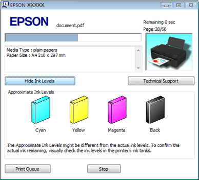 ![]() Индикаторът за напредъка се появява автоматично, когато стартирате заявка за печат. Можете да проверите приблизителните нива на мастилото от този прозорец. Щракнете върху бутон Approximate Ink Levels (Приблизителни нива на мастилото) в екрана на индикатора за напредъка, за да се покажат приблизителните нива на мастилото, както е показано по-долу.