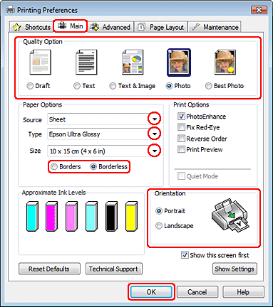 Щракнете върху бутона Main (Главно), след което изберете една от следните настройки на Quality Option (Опции за качество):