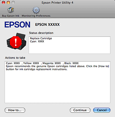 ![]() При изчерпване на мастилото се появява бутонът How to (Как да). Кликнете върху How to (Как да) и EPSON Status Monitor ще ви води стъпка по стъпка през процедурата за подмяна.