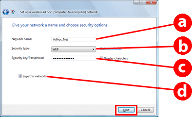 Изберете Computer-to-computer (ad hoc) networks only (Само мрежи компютър-компютър (ad hoc)).
