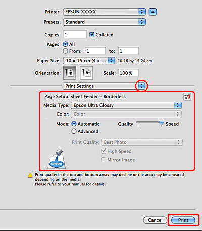 Chcete-li tisknout fotografie bez okrajů, vyberte možnost XXX (Sheet Feeder – Borderless) (Podavač listů – bez ohraničení).