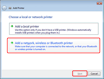 Vyberte položku Network printer (Síťová tiskárna) a potom klepněte na tlačítko Next (Další). ![]()