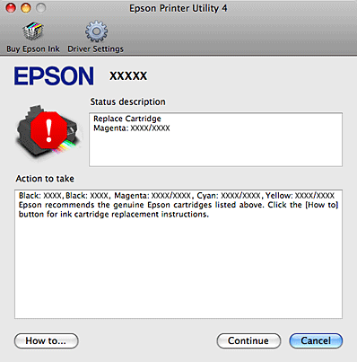 ![]() Pokud dochází nebo došel inkoust, zobrazí se tlačítko How to (Návod). Klepněte na tlačítko How to (Návod). Aplikace EPSON Status Monitor vás krok za krokem provede postupem výměny inkoustové kazety.