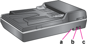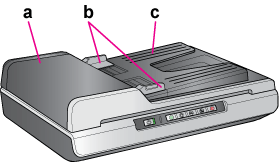 a. automatický podavač dokumentů (ADF) b. okrajové vodiče c. vstupní přihrádka