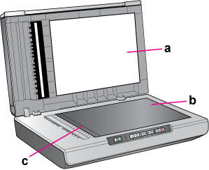 a. spodek automat. podavače b. deska dokumentu c. pojezd (v desce dokumentu)